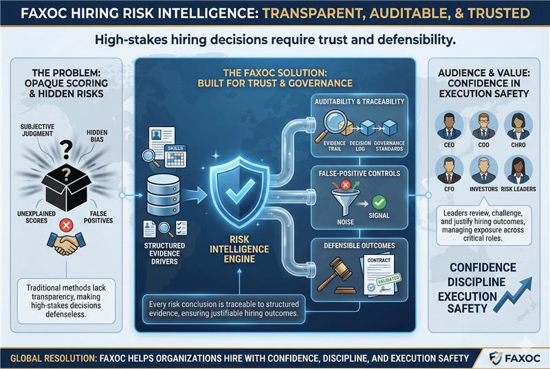 High-stakes hiring decisions require trust and defensibility. Faxoc ensures every risk conclusion is traceable to structured evidence drivers, not opaque scoring. Auditability, false-positive controls, and governance standards are built into the system so leaders can review, challenge, and justify hiring outcomes. This makes Faxoc suitable for CEOs, COOs, CHROs, CFOs, investors, and risk leaders managing execution exposure across critical roles. We help organizations hire with confidence, discipline, and execution safety.