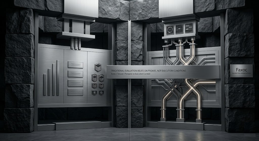 Conventional evaluation methods rely on indicators such as past roles, tenure, and organizational pedigree. These signals function as proxies and do not capture how execution performs under new conditions. As a result, organizations make decisions without visibility into execution risk. Faxoc replaces proxy-based evaluation with structured analysis of execution conditions, enabling more accurate and context-aware decision-making.